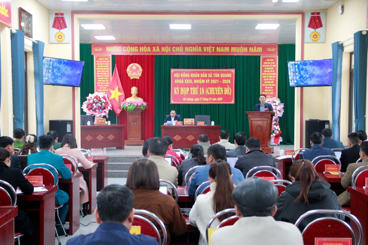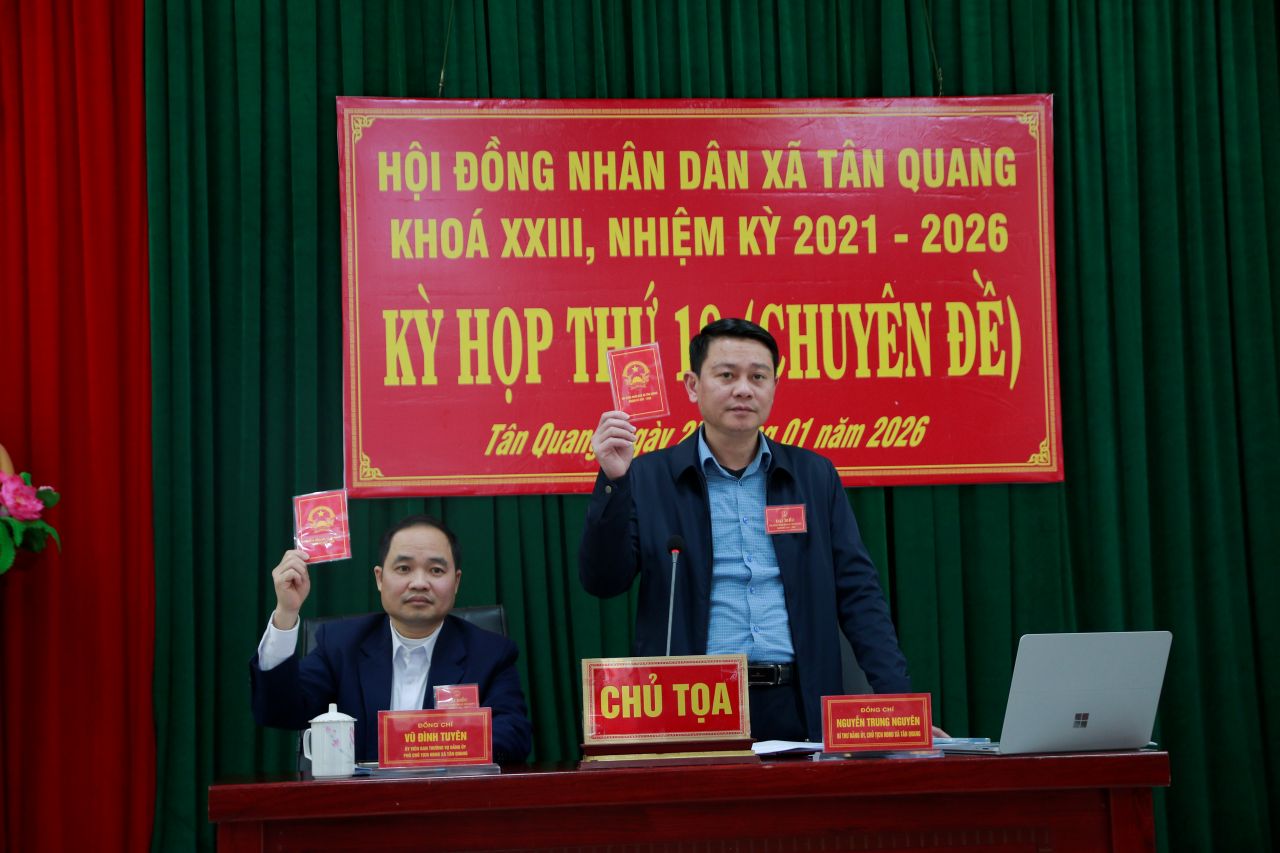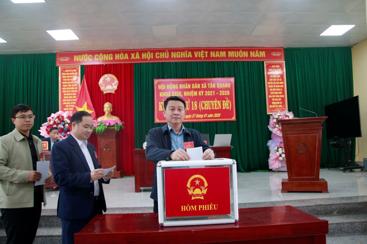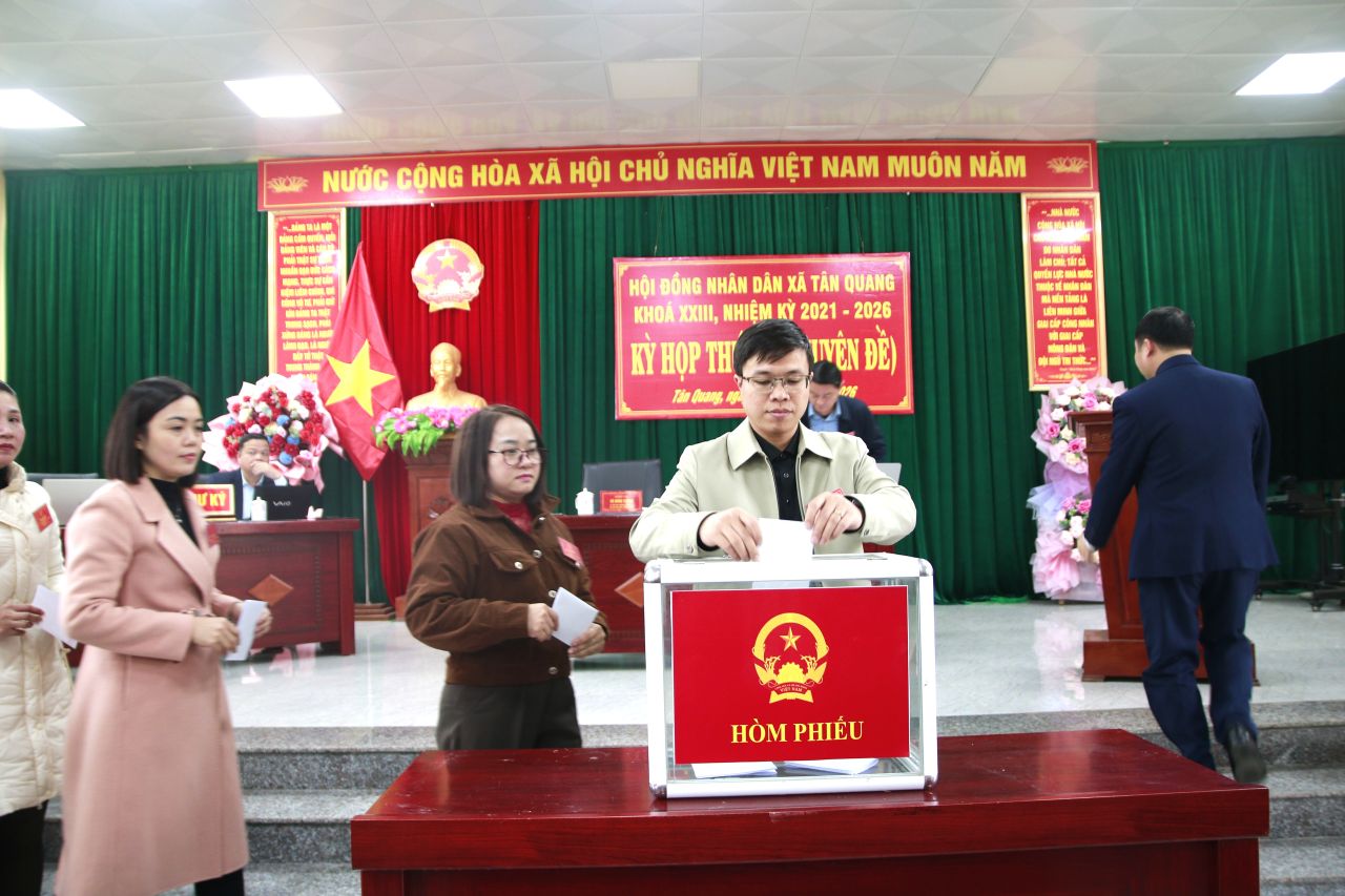 Bằng hình thức bỏ phiếu kín trực tiếp, các ông bà đại biểu dự Kỳ họp đã bầu đồng chí Trung tá Nguyễn Lê Duẩn, Chỉ huy trưởng BCH Quân sự xã tham gia thành viên UBND xã khoá XXIII, nhiệm kỳ 2021 – 2026. Đồng thời biểu quyết thông qua Nghị quyết tạm giao số lượng người làm việc và số lượng hợp đồng lao động làm công việc chuyên môn, nghiệp vụ đối với Trạm y tế xã. Nghị quyết về việc cho chủ trương phê duyệt phương án sử dụng tiền dịch vụ môi trường rừng phục vụ công tác quản lý, bảo vệ rừng trên địa bàn xã Tân Quang, tỉnh Tuyên Quang năm 2026./.