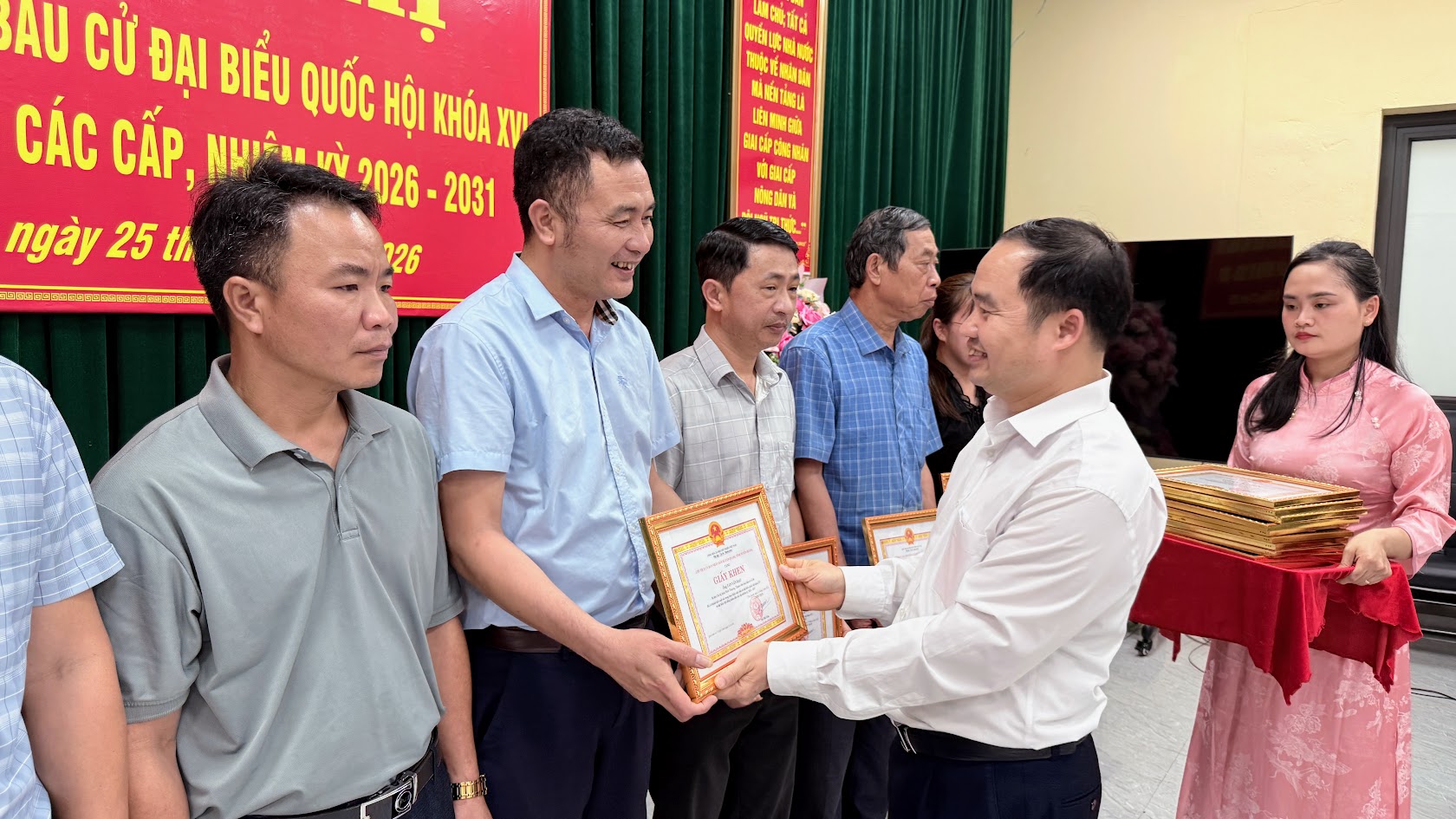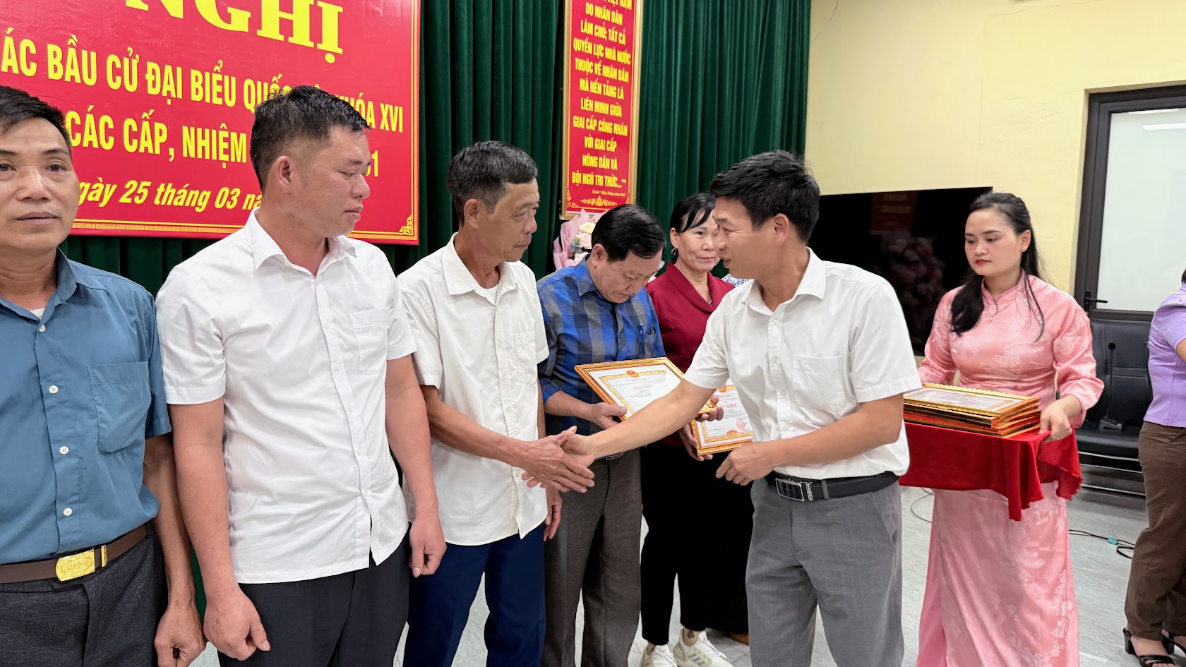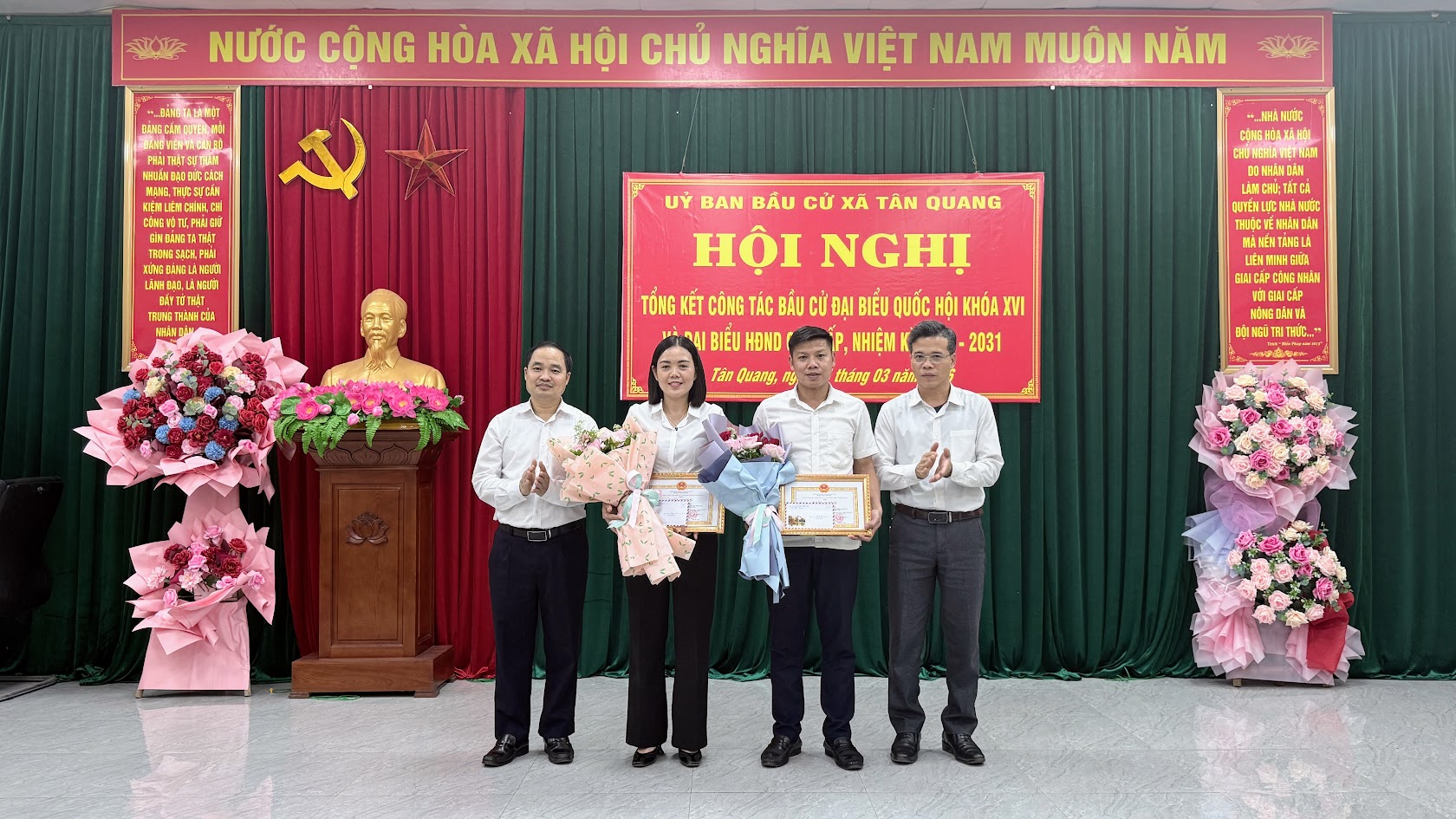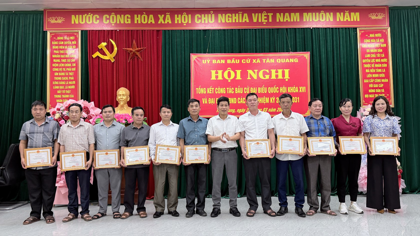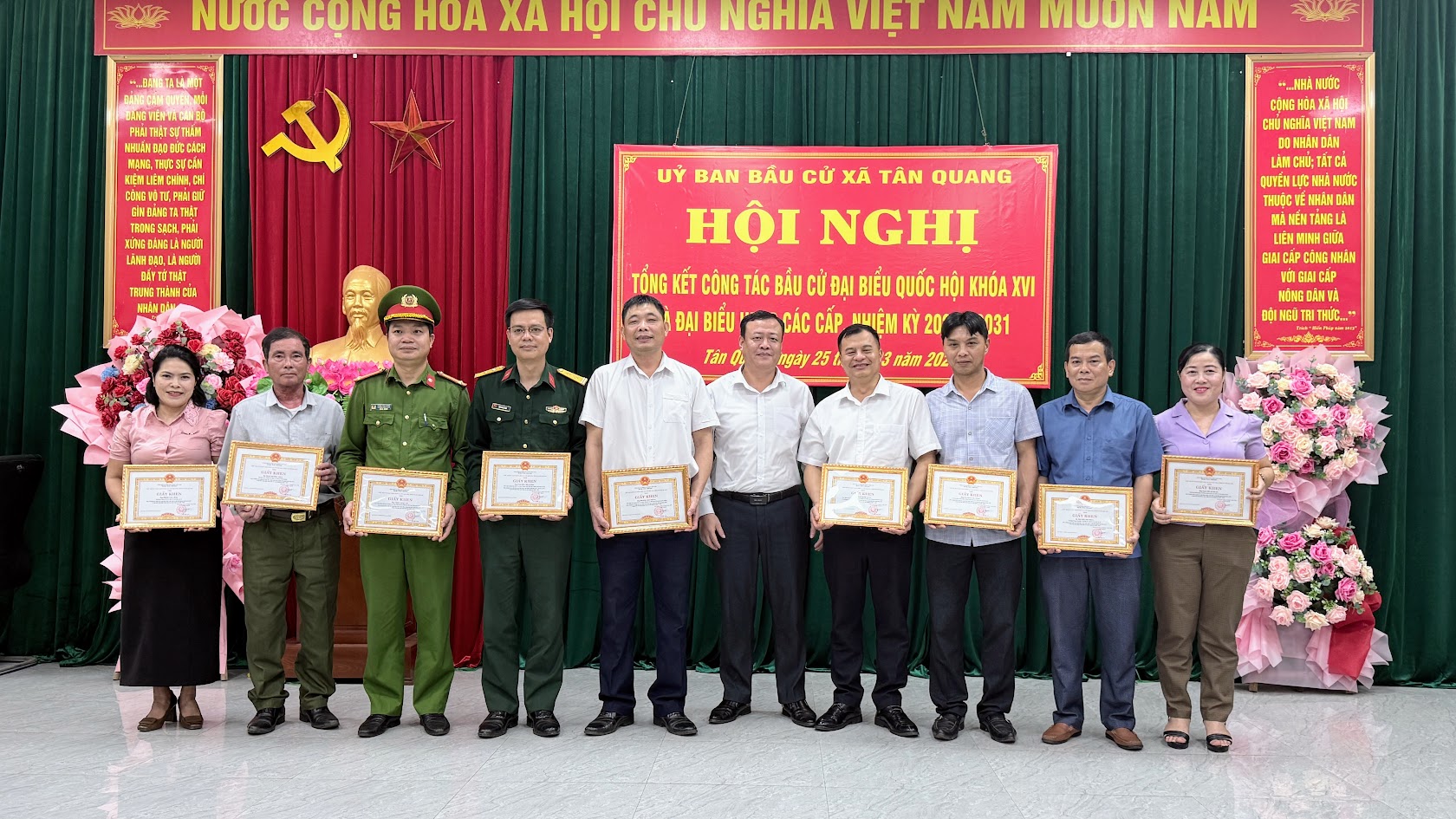 Hội nghị đã trao các giải nhất, nhì, ba cho các đơn vị bầu cử trong phong trào thi đua hoàn thành xuất sắc công tác bầu cử đại biểu Quốc hội và đại biểu HĐND các cấp; trao giấy khen của Chủ tịch UBND xã cho 2 tập thể và 86 cá nhân có thành tích xuất sắc trong công tác bầu cử đại biểu Quốc hội khóa XVI và đại biểu HĐND các cấp