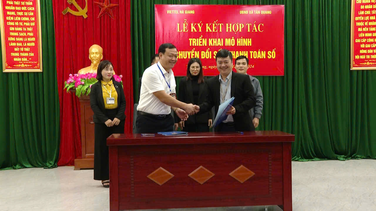 UBND xã Tân Quang và Viettel Hà Giang đã ký kết kế hoạch hợp tác chuyển đổi số, triển khai một số nhiệm vụ trong tâm trong năm 2025 trong đó tập trung vào nội dung hướng dẫn cán bộ, công chức, viên chức sử dụng phần mềm trợ lý ảo dành cho việc tìm kiếm và truy xuất thông tin văn bản pháp luật và trong công việc; cài đặt chữ ký số cá nhân cho công dân trong độ tuổi; phát triển phương thức thanh toán bằng mã QR Viettel Money cho các hộ kinh doanh và tiểu thương trên địa bàn xã sử dụng cho việc thanh toán thuận tiện bằng cách quét mã QR trong mua bán; Xây dựng tuyến phố thanh toán số; cung cấp các giải pháp ứng dụng truy xuất nguồn gốc (icheck, Vmark) cho các sản phẩm nông sản tại địa phương, đặc biệt là các mặt hàng tiêu chuẩn OCOP.
